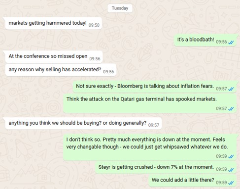 Pras and I had been discussing over the past week about adding to our position as the already cheap shares hadn’t really moved on the news. I give Pras a call to discuss and we decided to add 25bp to our position – not a particularly heroic move but one which felt sensible – taking advantage of the fact that, as a small-cap stock, Steyr was getting caught up unfairly in the market selling.
