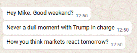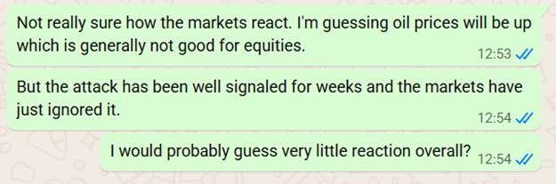We chatted back and forth for half an hour or so: what was the reaction in crypto markets, how much are oil futures up? The Saudi and Egyptian stockmarkets were open and trading down about 2% giving us a useful datapoint on how European markets might react in the morning.